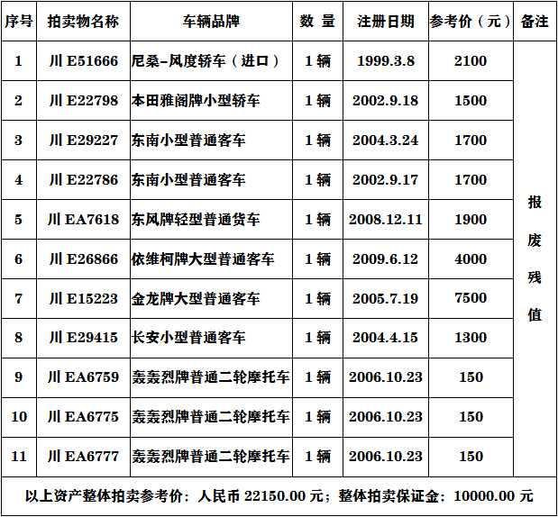 二、注意事項:參與報廢車輛的競買人必須具有收取報廢車輛的相關(guān)資質(zhì)。